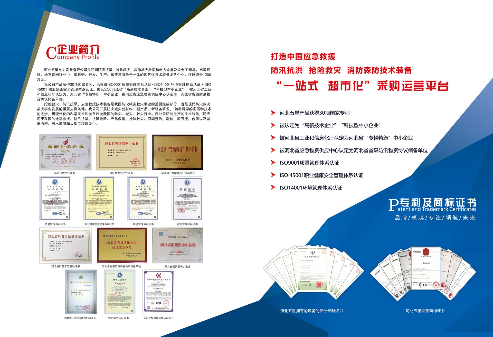 河北五星電力設備有限公司是我國防汛抗旱、搶險救災、應急減災救援和電力設備及安全工器具、市政設施、地下管網(wǎng)行業(yè)中,集科研、開發(fā)、生產、銷售及服務于一體的現(xiàn)代化技術裝備高新技術企業(yè),注冊資金1200萬元。
